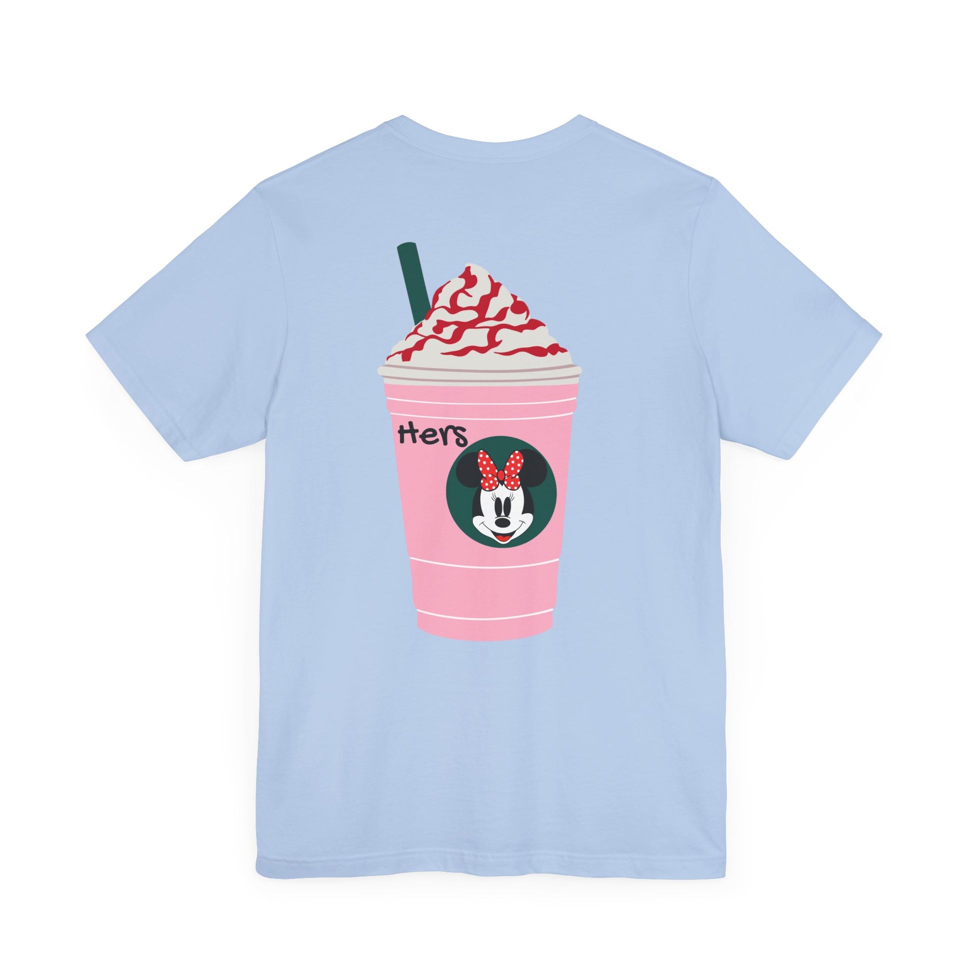 A Hers Pink Starbucks feat Minnie Mouse T-Shirt that matches perfectly with our His version featuring Mickey Mouse. This fun and playful design is perfect for Disney fans, Starbucks fans and couples. Ideal for casual wear, theme park visits, and date nights.