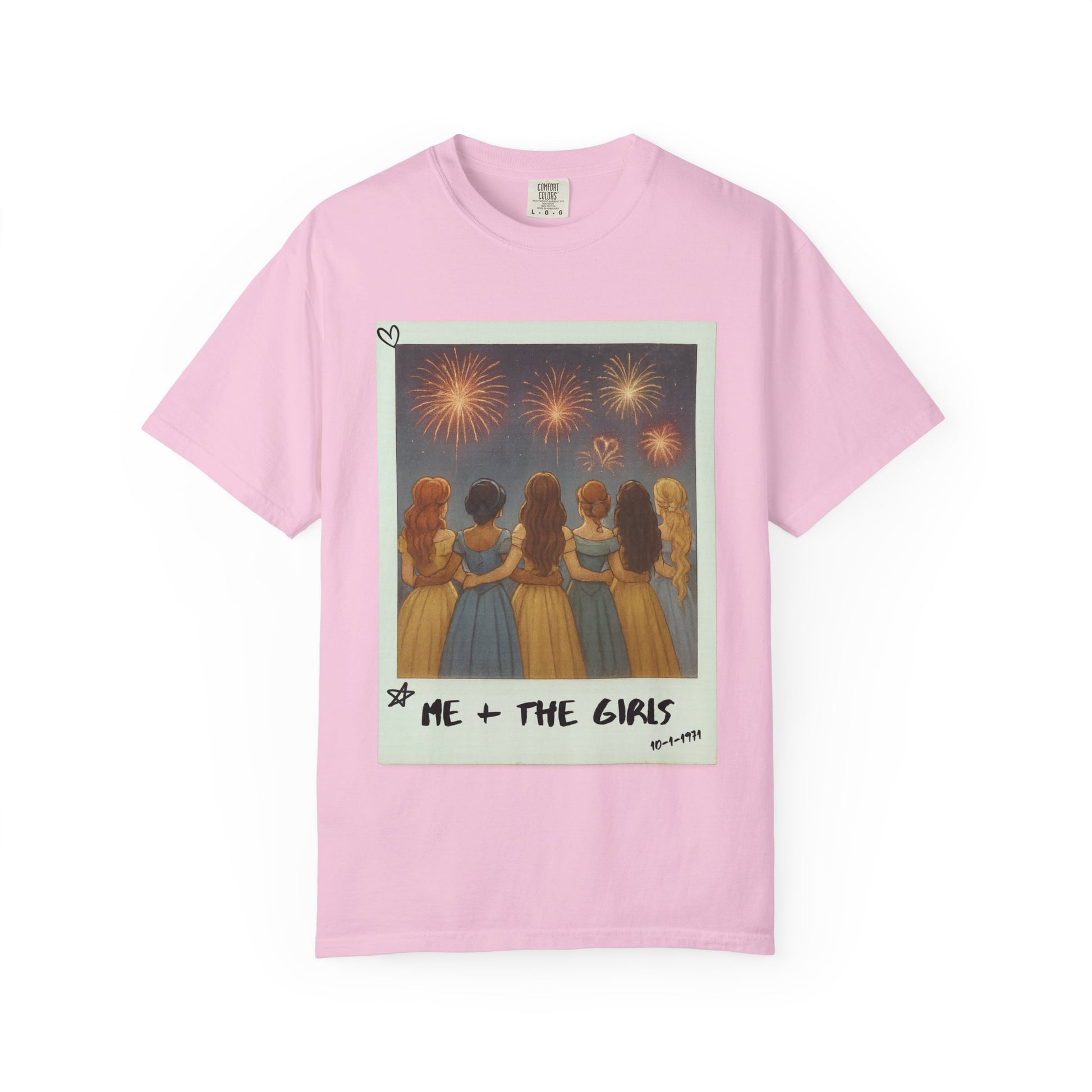 Disney tee featuring a polaroid of 5 Disney princesses enjoying time together and watching the fireworks with a handwritten message on the polaroid that say Me + The Girls. Perfect for Disney fans looking for a fun and nostalgic design to add to their wardrobe. Ideal for wearing to Disney parks, themed parties, or casual outings with friends.
