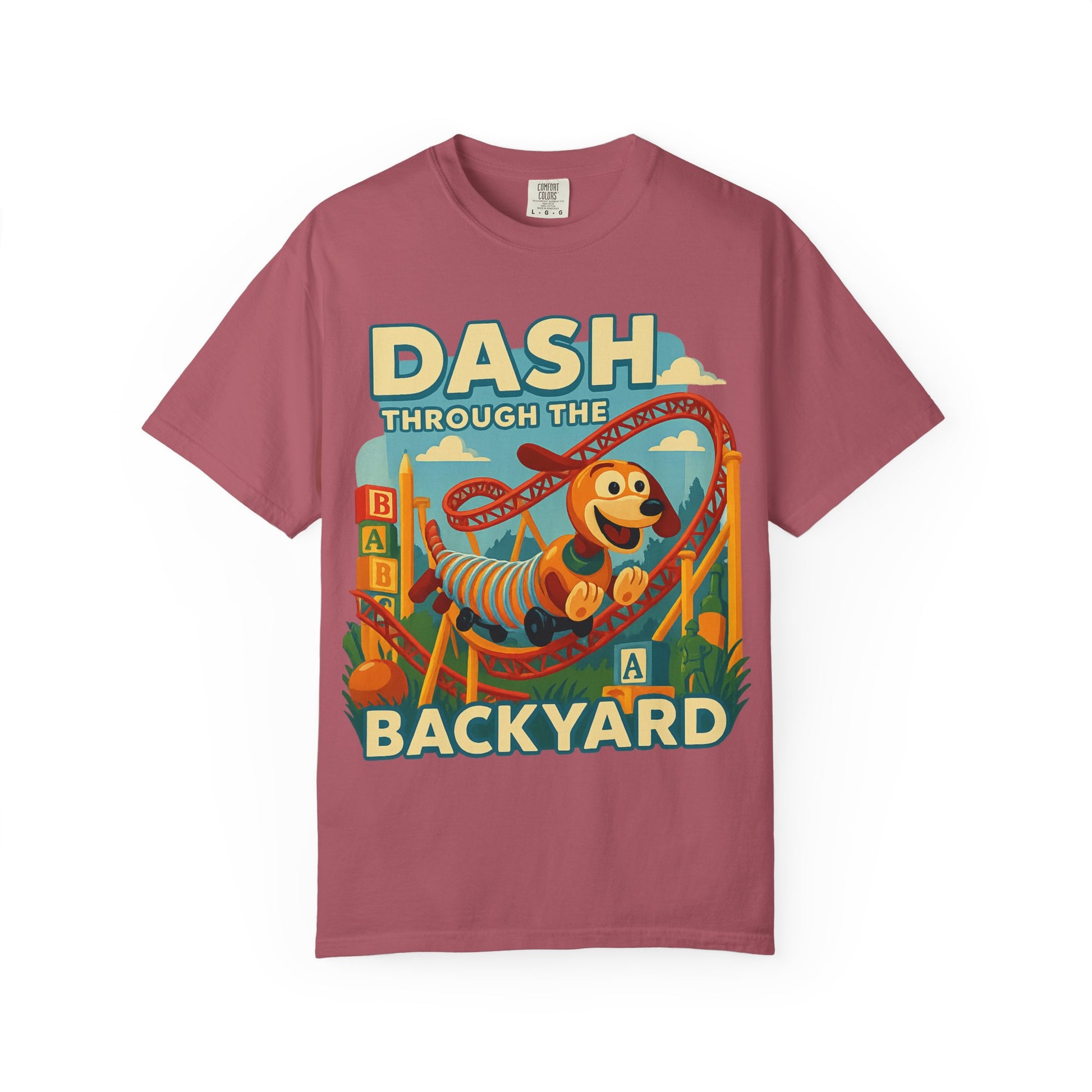A playful and colorful T-shirt featuring the slinky dog roller coaster from Hollywood Studios. This garment-dyed tee is perfect for adults who love fun and vibrant designs, making it ideal for theme park visits, casual outings, and Disney enthusiasts.