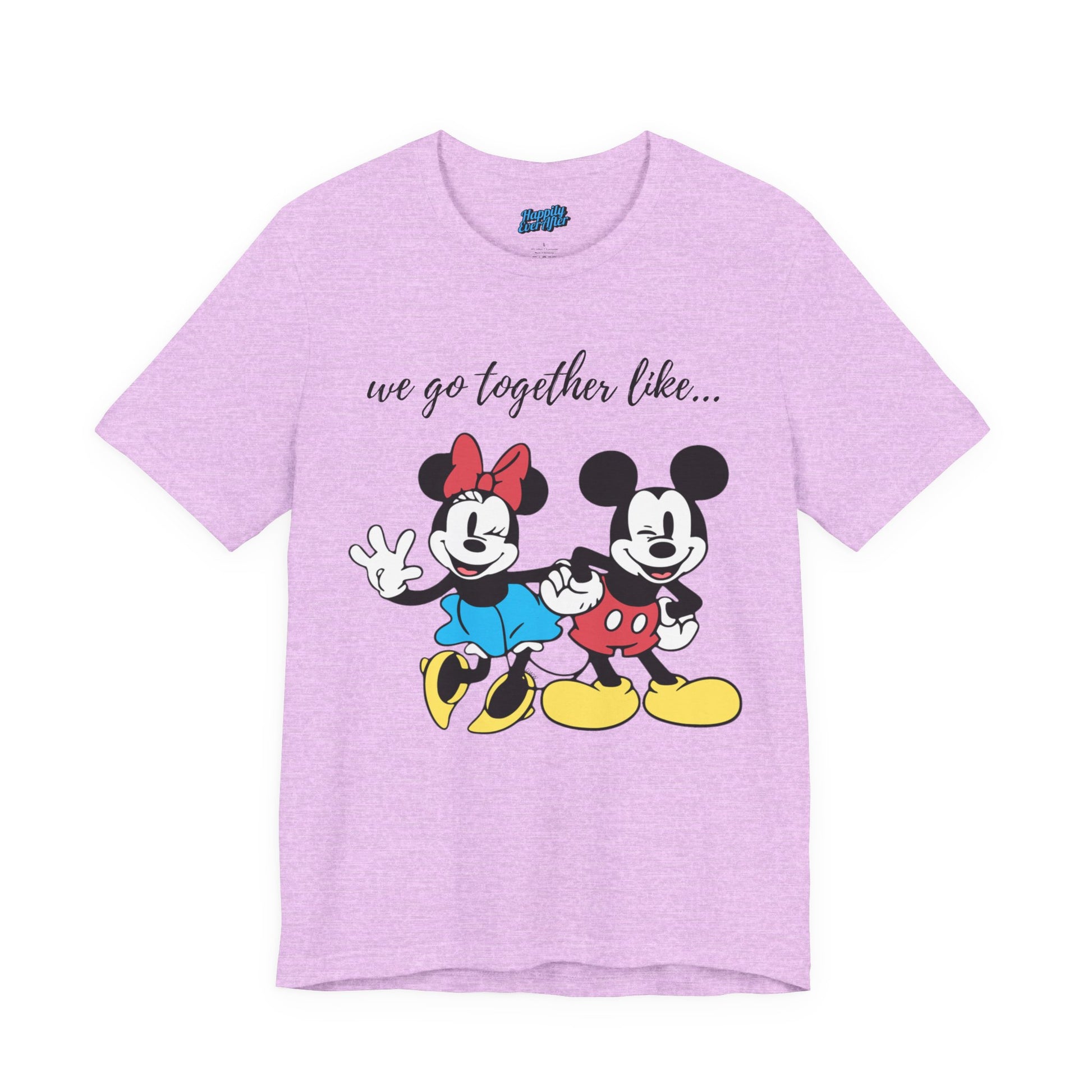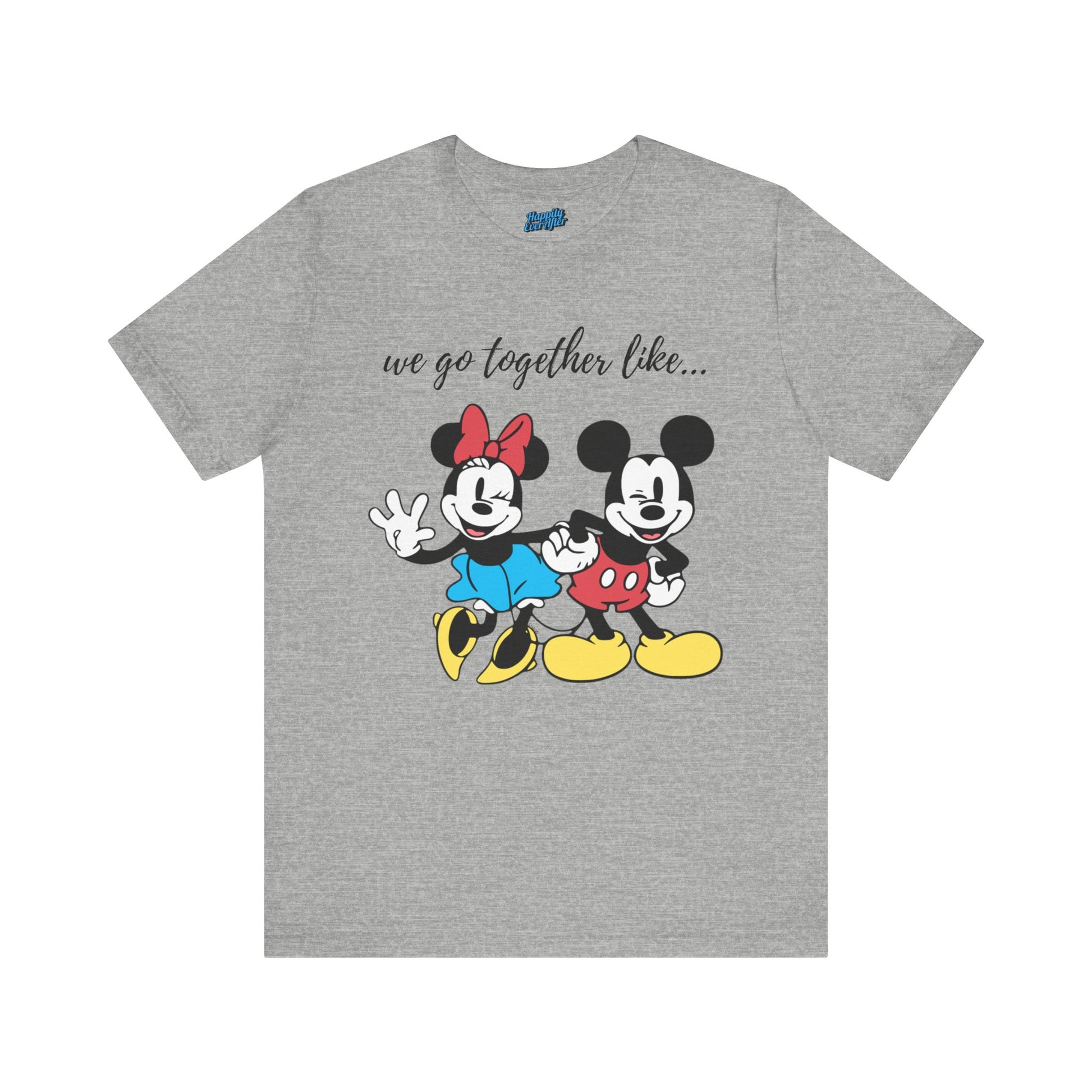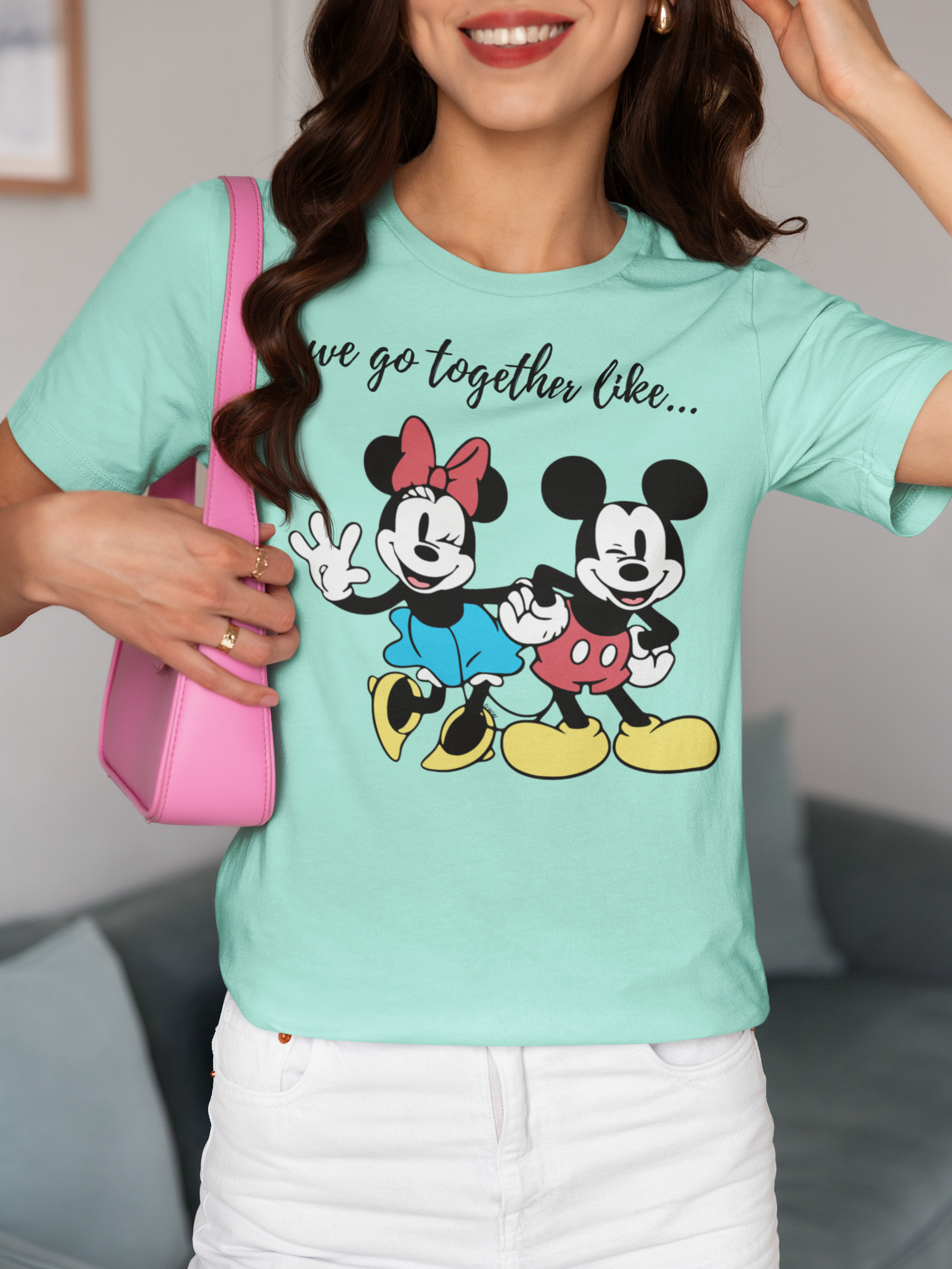 A Tee featuring a design that reads 'We Go Together Like,' perfect for matching with your special loved one. This Tee exudes a cute and playful vibe, ideal for couples and Disney fans. Perfect for Valentine's Day, anniversaries, and everyday wear.